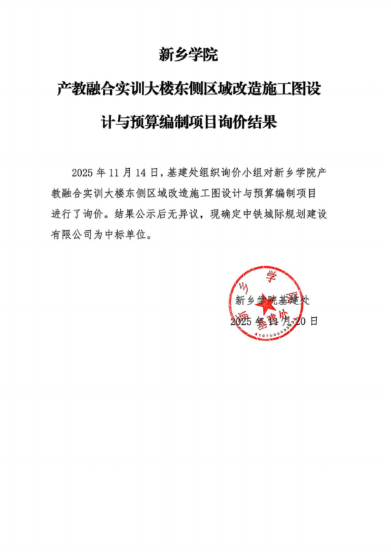 新乡学院产教融合实训大楼东侧区域盖章施工图设计与预算编制项目询价结果